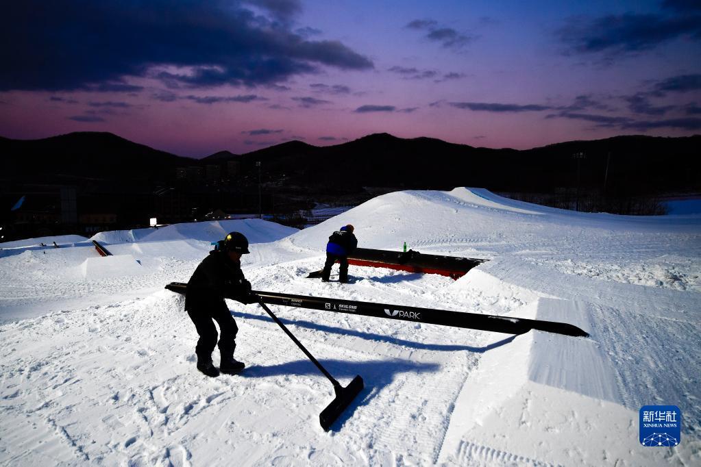 这是2022年12月9日,V-PARK地形公园团队成员在布置场地道具。