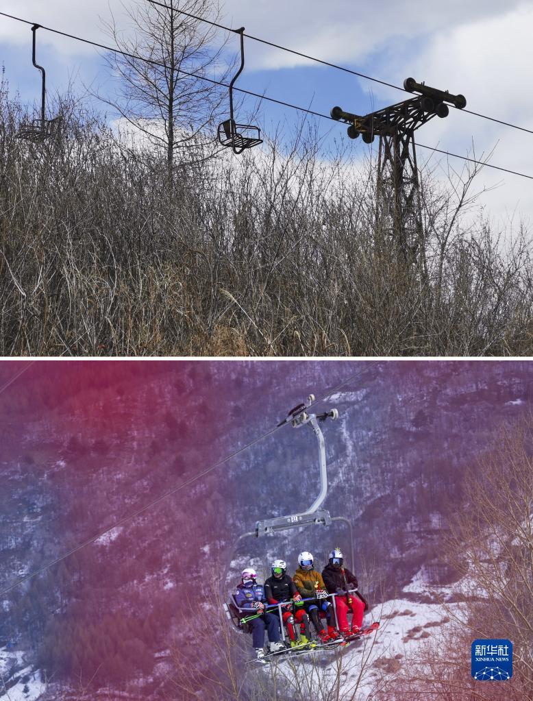 这是一张拼版照片。上图:这是金厂滑雪场老式缆车的资料图片;下图:2023年2月10日,滑雪爱好者在万峰通化滑雪度假区乘坐缆车(新华社记者颜麟蕴摄)。