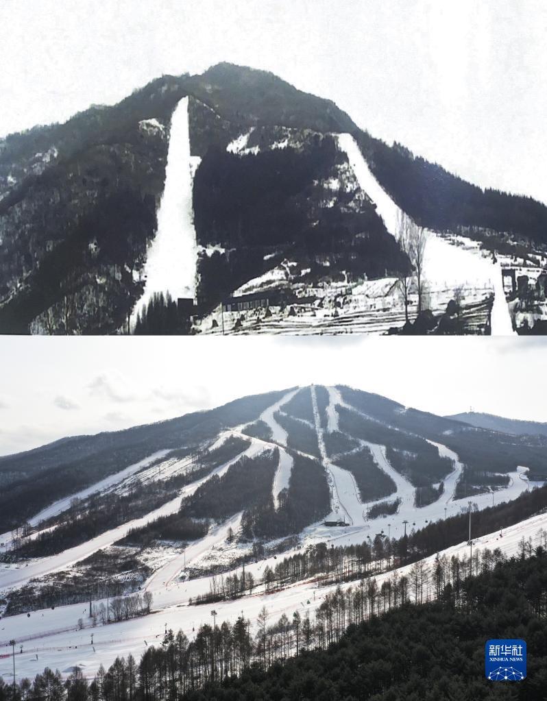 这是一张拼版照片。上图:早年间仅有两条雪道的金厂滑雪场(资料照片);下图:2023年2月10日拍摄的万峰通化滑雪度假区(无人机照片,新华社记者许畅摄)。
