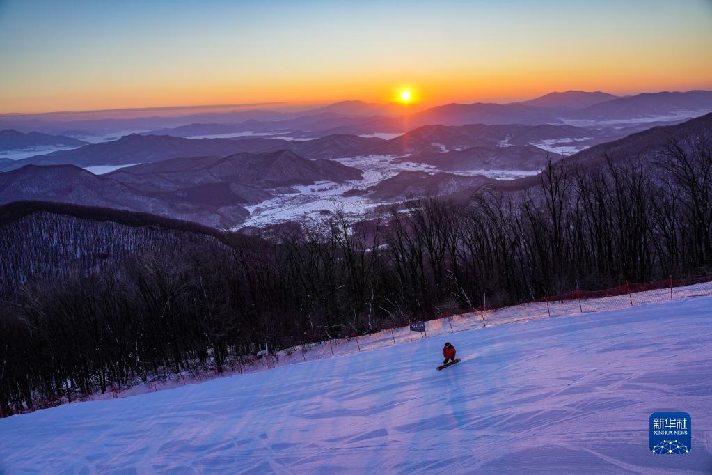 2023年1月1日,在吉林市万科松花湖度假区,滑雪爱好者在清晨的阳光下滑雪。