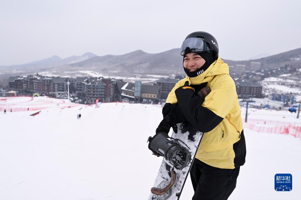 这是2023年2月10日,宋成珉在通化新建的越野滑雪训练场地拿着新式滑雪板留影。