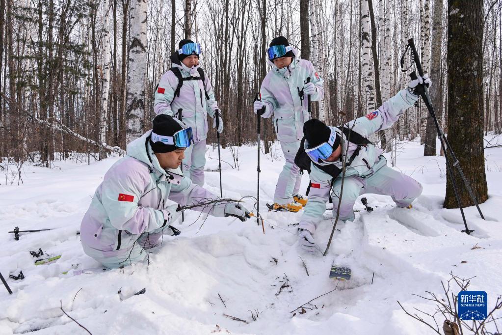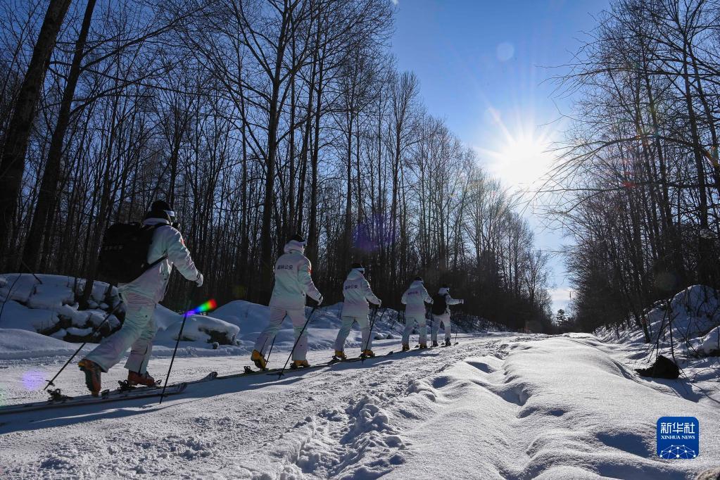 2023年2月7日,松江河森林公安分局雪上巡逻案件侦查大队的建队人王建波与队友们滑雪下山。