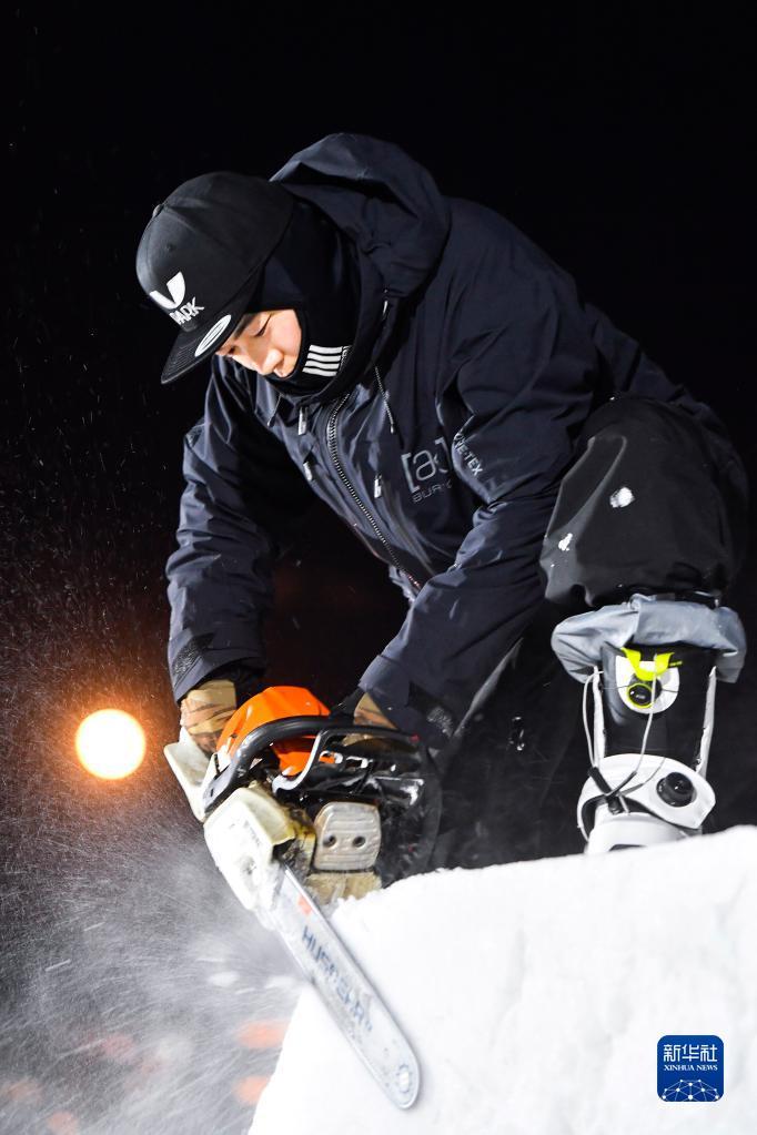 这是2022年12月9日,魏维使用电锯进行跳台塑形工作。