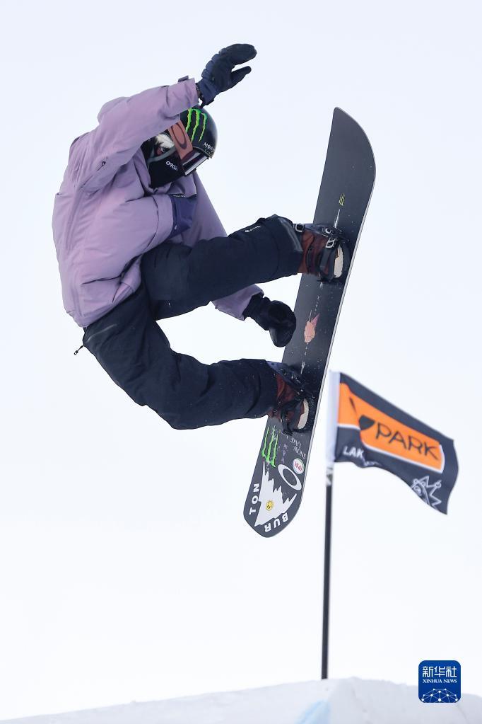 这是2022年12月10日,北京冬奥会单板滑雪男子大跳台冠军苏翊鸣在V-PARK地形公园内高高跃起。