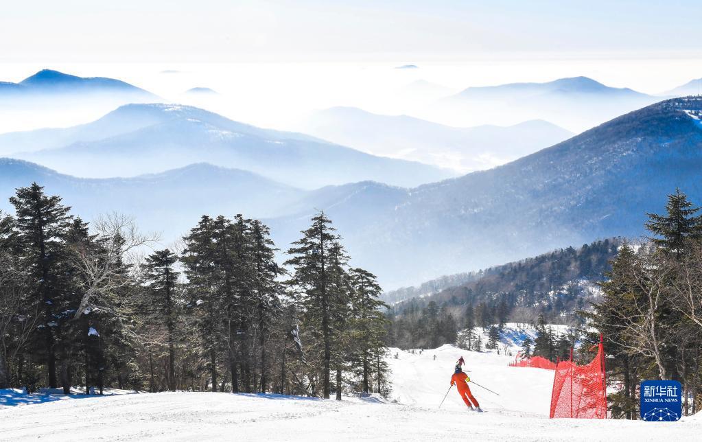 这是2020年1月26日,滑雪爱好者在吉林市冰雪试验区北大湖滑雪度假区滑雪。