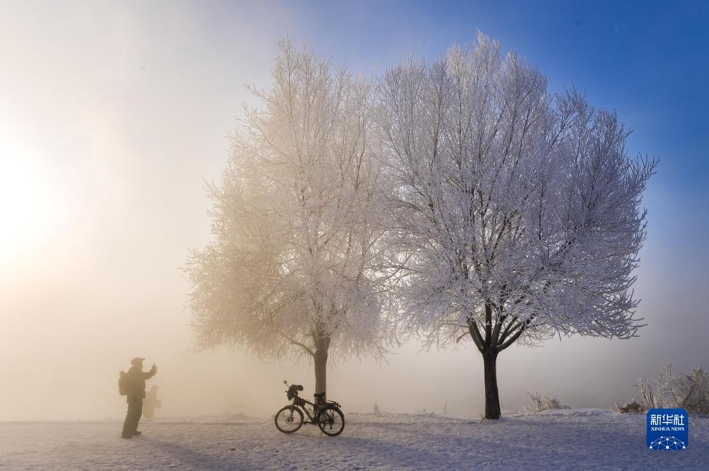 2018年1月11日,游客在吉林市丰满区松花江畔观赏雾凇景观。