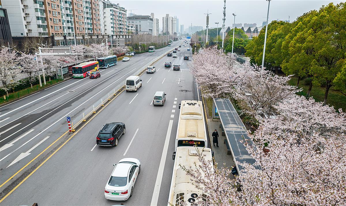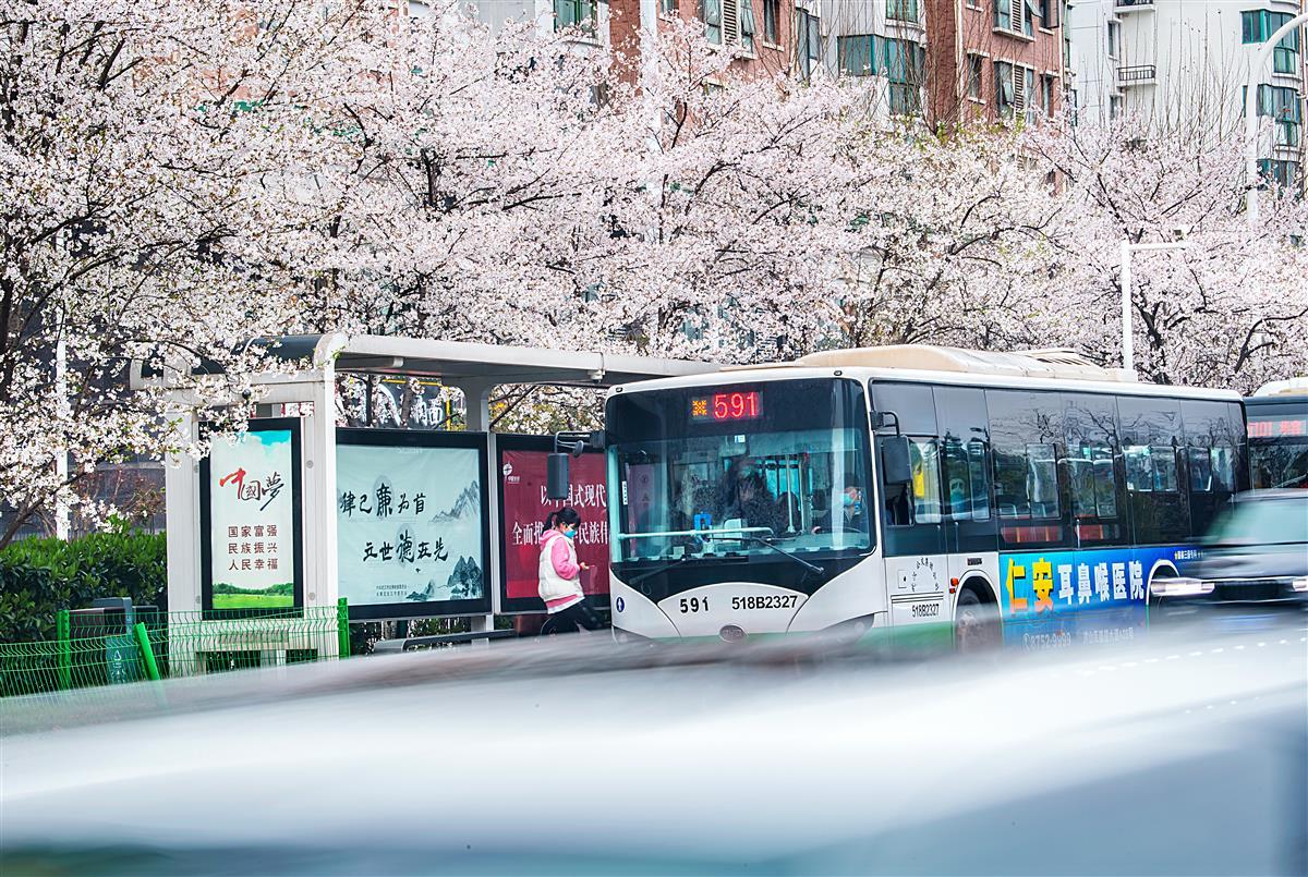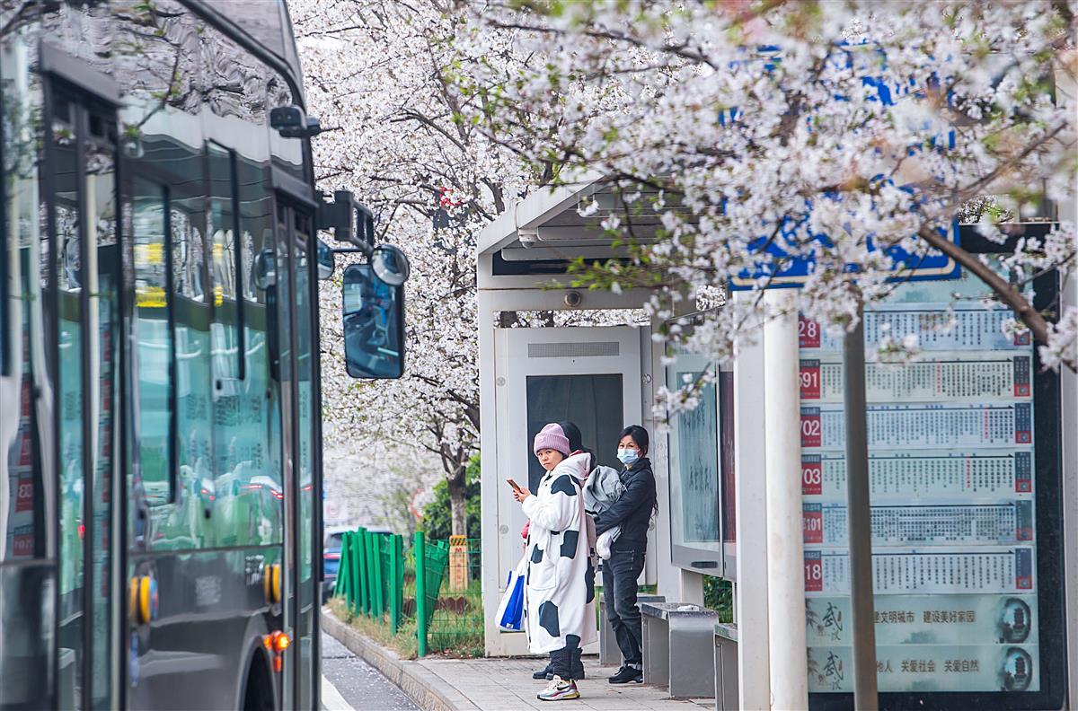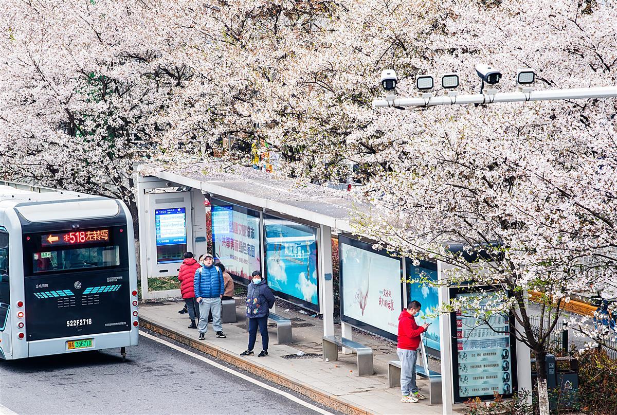 又是一年樱花季。在武汉珞瑜东路,大黄村、叶麻店两个公交车站被浪漫樱花装扮,变身“樱花车站”。满树雪白的樱花开满枝头,在风中,花雨飘飞,落英缤纷,十分浪漫。叶麻店、大黄村公交站分别位于华中科技大学体育馆和光谷四小天桥附近,两个站均在珞瑜东路上,相距约1公里。