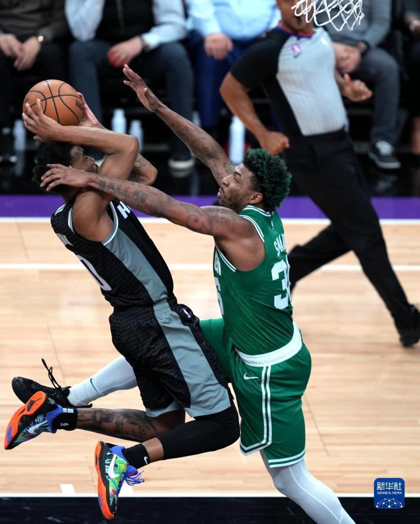 3月21日,凯尔特人队球员马库斯·斯马特(右)在比赛中防守国王队球员马利克·蒙克。新华社记者 吴晓凌 摄