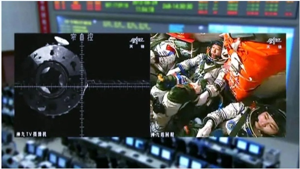 空间站上航天员根据测量参数遥控追踪飞行器完成的交会对接。