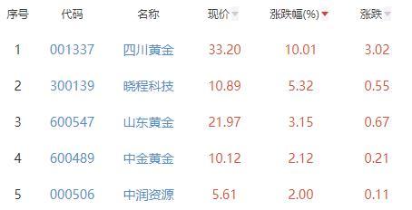 其中,四川黄金、晓程科技、山东黄金、中金黄金、中润资源位列板块涨幅前五位,涨幅分别为10.01%、5.32%、3.15%、2.12%、2.00%。