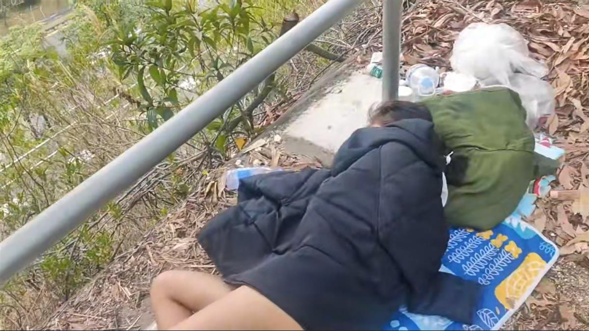 之后,黄先生在小溪边发现一名独坐的女孩,她看起来20岁出头,身穿一件破旧的短袖搭背带短裙,形容邋遢,想必就是那些露宿用品的主人。