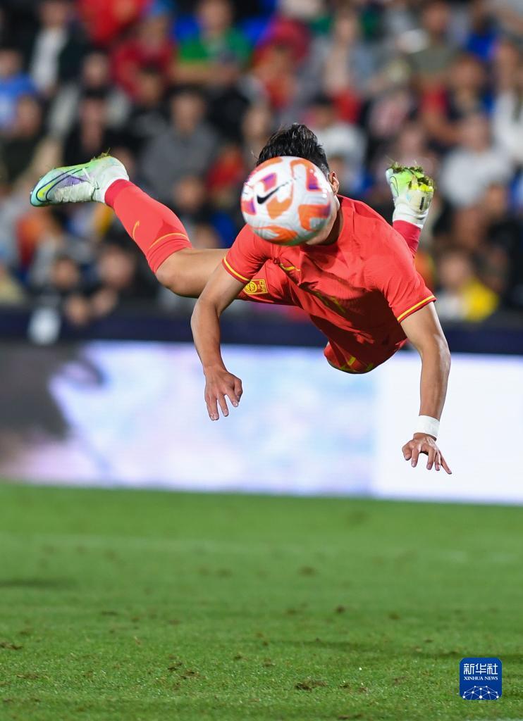 3月23日,中国队球员林良铭在比赛中鱼跃头球攻门。新华社记者 郭磊 摄