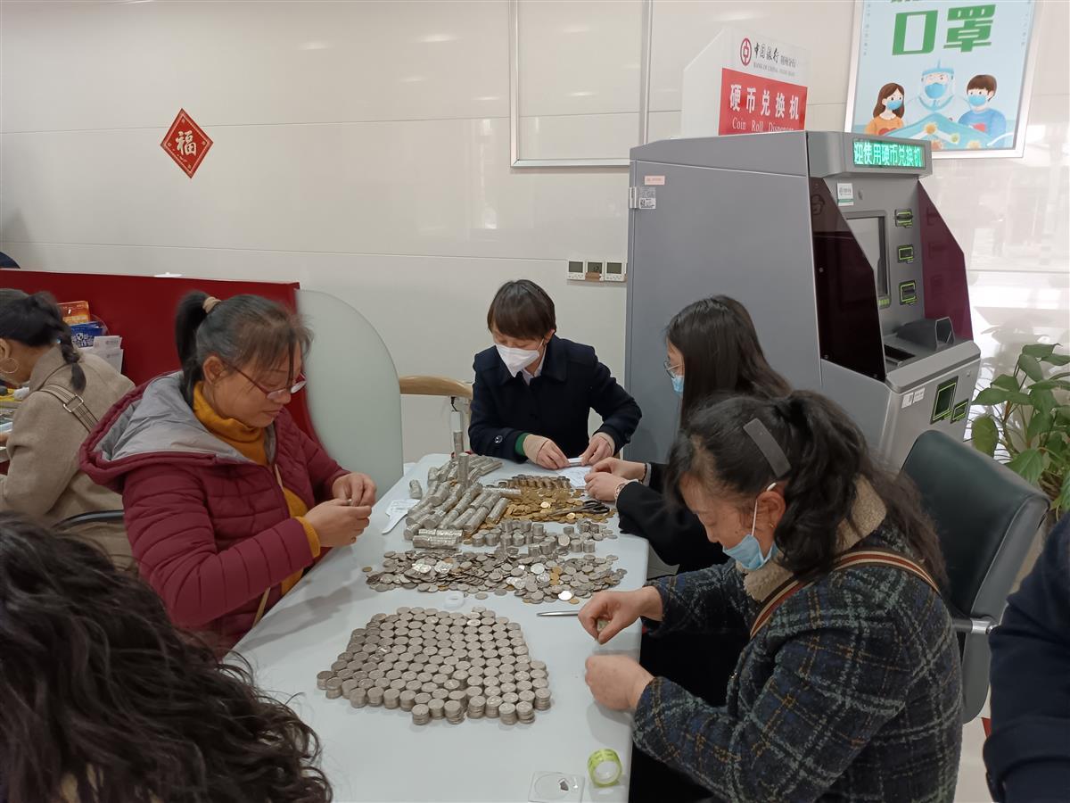 挑拣、清点、码放、封包……网点工作人员开始了紧张而有序地分拣工作,工作人员主动放弃中午休息时间,经过近5个小时的清点核对,一枚枚硬币在工作人员手中卷成捆、封成包,化零为整,最终该网点高效地为杨女士兑换了18038元现金。