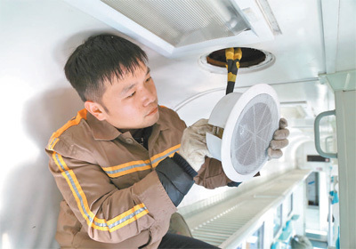 王磊正在检查卧铺车厢广播喇叭连接端子是否紧固。 |