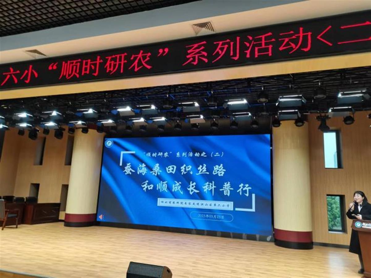 当天举办的“桑与蚕之歌”科普讲座正是开展“顺时研农”校本课程的体现。在该校报告厅,莫荣利用生动形象的科普视频向孩子们展示了蚕生长发育的一生。又黑又小的蚁蚕逐渐长成白白胖胖的蚕宝宝……孩子们目不转睛地盯着这个神奇的过程。
