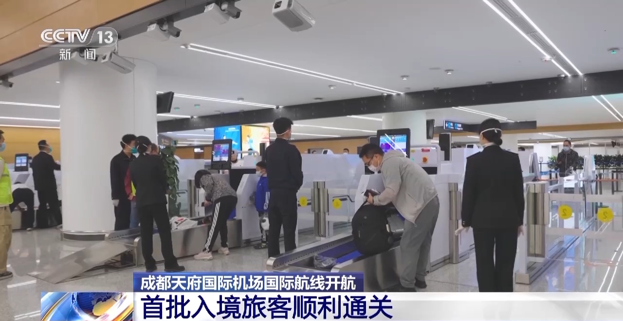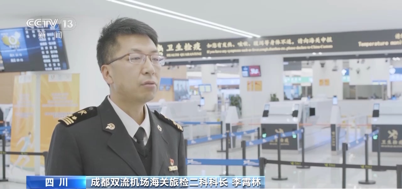 成都双流机场海关旅检二科科长 李霄林:这个一体化智能闸机可以让旅客在7.5米距离内完成体温监测、健康申明卡验核、手提行李过机检查、风险因子探测等4个通关环节,在全国率先探索将手提行李检查环节前置。今天首个入境航班单名旅客完成上述通关流程仅用30秒。