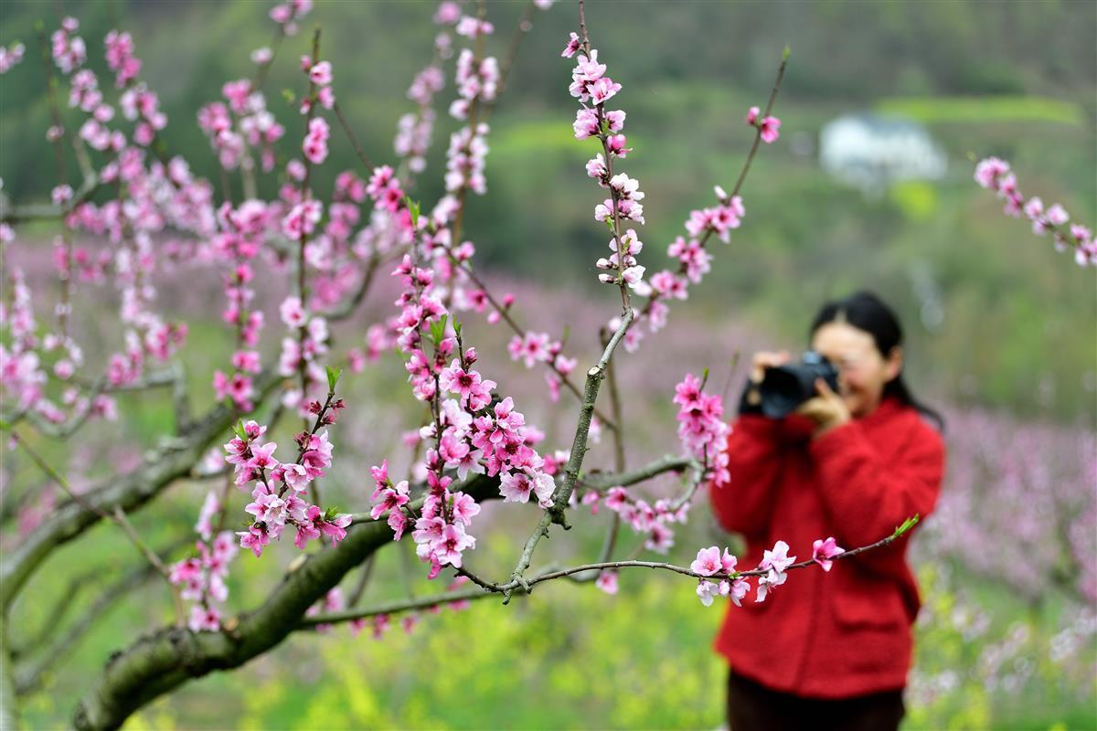 游客在桃园拍摄桃花(杨韬摄)