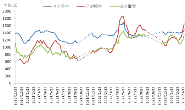 截至3月20日,全国脐橙销地批发周度均价为8.94元/公斤,环比(3月13日,下同)上涨0.9%,同比(2022年3月18日,下同)上涨12.10%;全国沃柑销地批发周度均价为6.84元/公斤,环比上涨3.64%,同比上涨6.28%;全国砂糖橘销地批发周度均价为6.60元/公斤,环比下跌2.68%,同比上涨15.61%。
