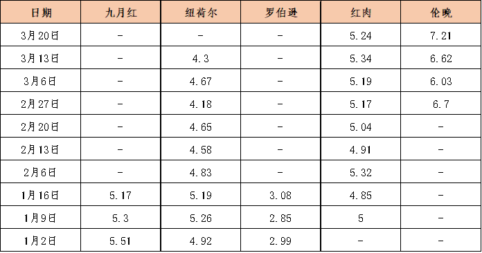 在脐橙产地收购方面,秭归中熟脐橙品种——纽荷尔脐橙仅剩零星交易,即将下市,晚熟脐橙品种——秭归伦晚陆续成熟,开始大批量上市,本期伦晚收购量较上期环比上涨11.67%。价格方面,截至3月20日,秭归伦晚脐橙产地收购均价报7.21元/公斤,环比上涨8.91%;秭归红肉脐橙产地收购均价报5.24元/公斤,环比下跌1.86%。