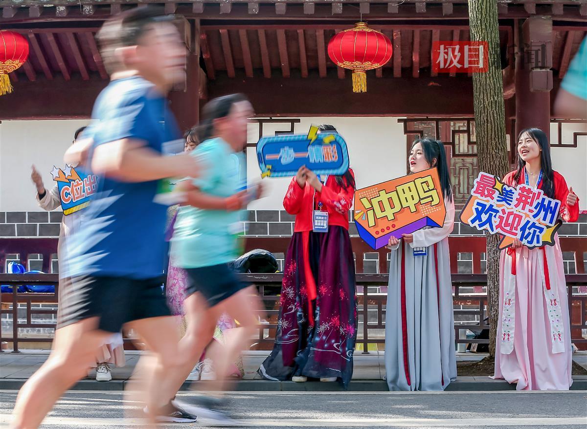 马拉松选手跑进荆州古城,志愿者在加油助威