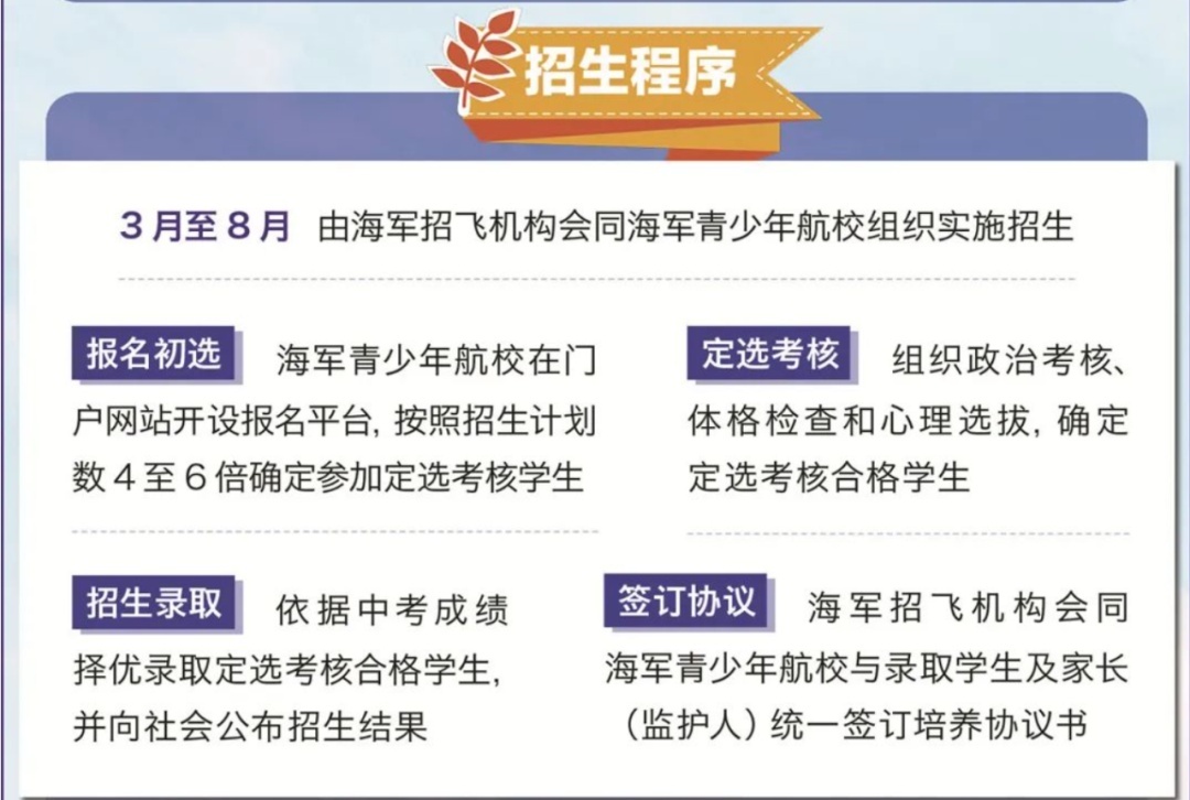自然条件:初中应届毕业生,男性,2006年8月31日至2009年8月31日之间出生,具有海军青少年航校所在省份学籍和海军招飞省份户籍,符合所在省份招生考试报名条件。