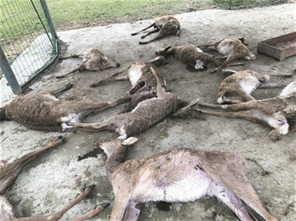 3月26日上午,基地工作人员发现,一个园区内的14只鹿死了12只,1只严重受伤,另1只逃走了。这些鹿的致命伤口都在咽喉部位,气管被咬断,有的腿部、腹部还被撕开了皮肉。