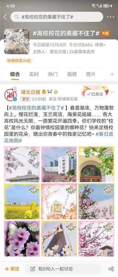 湖北日报讯(记者陈熹)3月27日,由本报发起,全国高校参与的“高校校花的美藏不住了”活动,发布话题不到三小时,就冲上新浪微博全国热搜榜,47所高校纷纷晒出校园春色,截至发稿时,阅读量超过2600万。