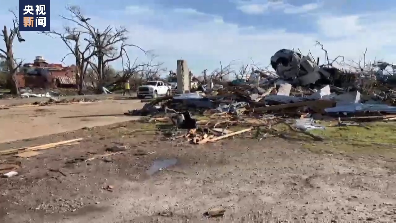 央视记者 刘旭:我现在所在的位置是密西西比州的罗灵福克镇。大家可以通过镜头看到这里的树木倒塌非常严重,一片废墟。有一定高度的建筑几乎都被龙卷风吹倒塌。