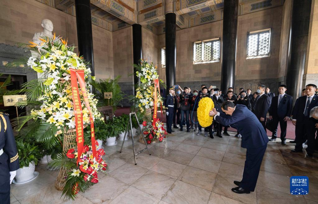 3月28日上午,中国国民党前主席马英九一行拜谒南京中山陵。这是在中山陵祭堂,马英九向孙中山坐像敬献花环。