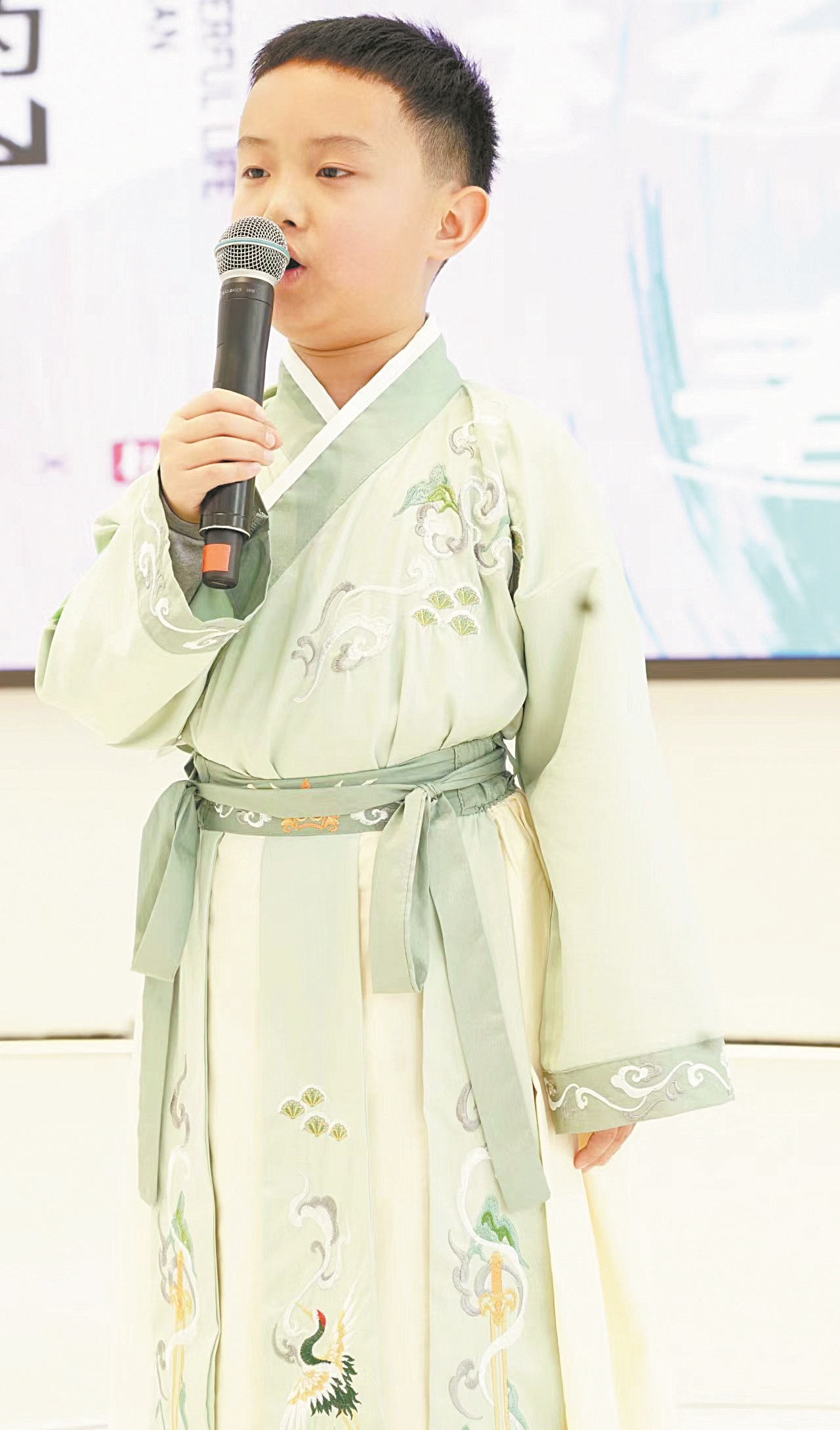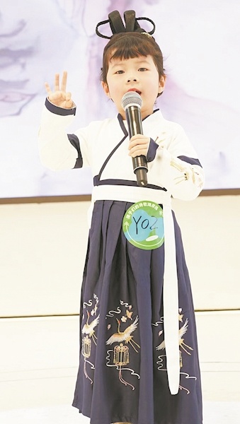 精美的华服和发饰,稚嫩可爱的架势,4岁的韩言蹊一出场就萌翻了全场。没想到的是,小小个子的她却将一首《将进酒》朗读得铿锵有力,将气场拉满,让人忍不住给她点赞。最终,她获得了幼儿组一等奖的好成绩。“从1岁2个月就开始进行亲子绘本共读,再大一点就是古典诗词的熏陶。”韩言蹊的妈妈是一名幼师,她说,韩言蹊对诗词韵律的领悟力很强,这是她第一次参加朗诵比赛,特别开心。