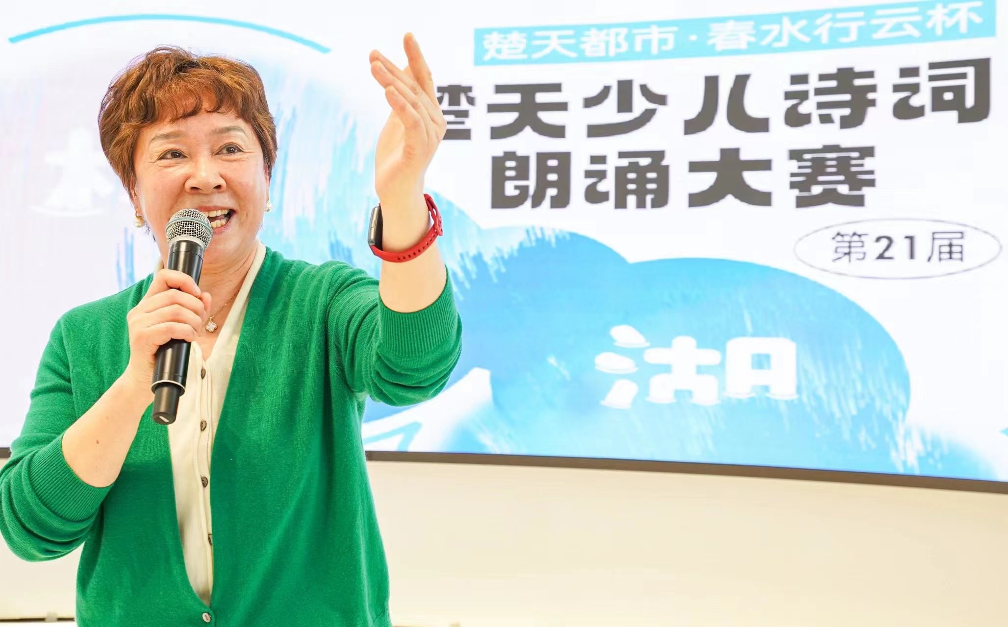 我是第六次来参加楚天少儿诗词朗诵大赛了。中国是诗的国度,孩子是祖国的花朵和未来,让孩子从小接受诗歌的美育,让孩子在读诗中成长,在艺术创作中成长,没有比这样的活动更合适的了。