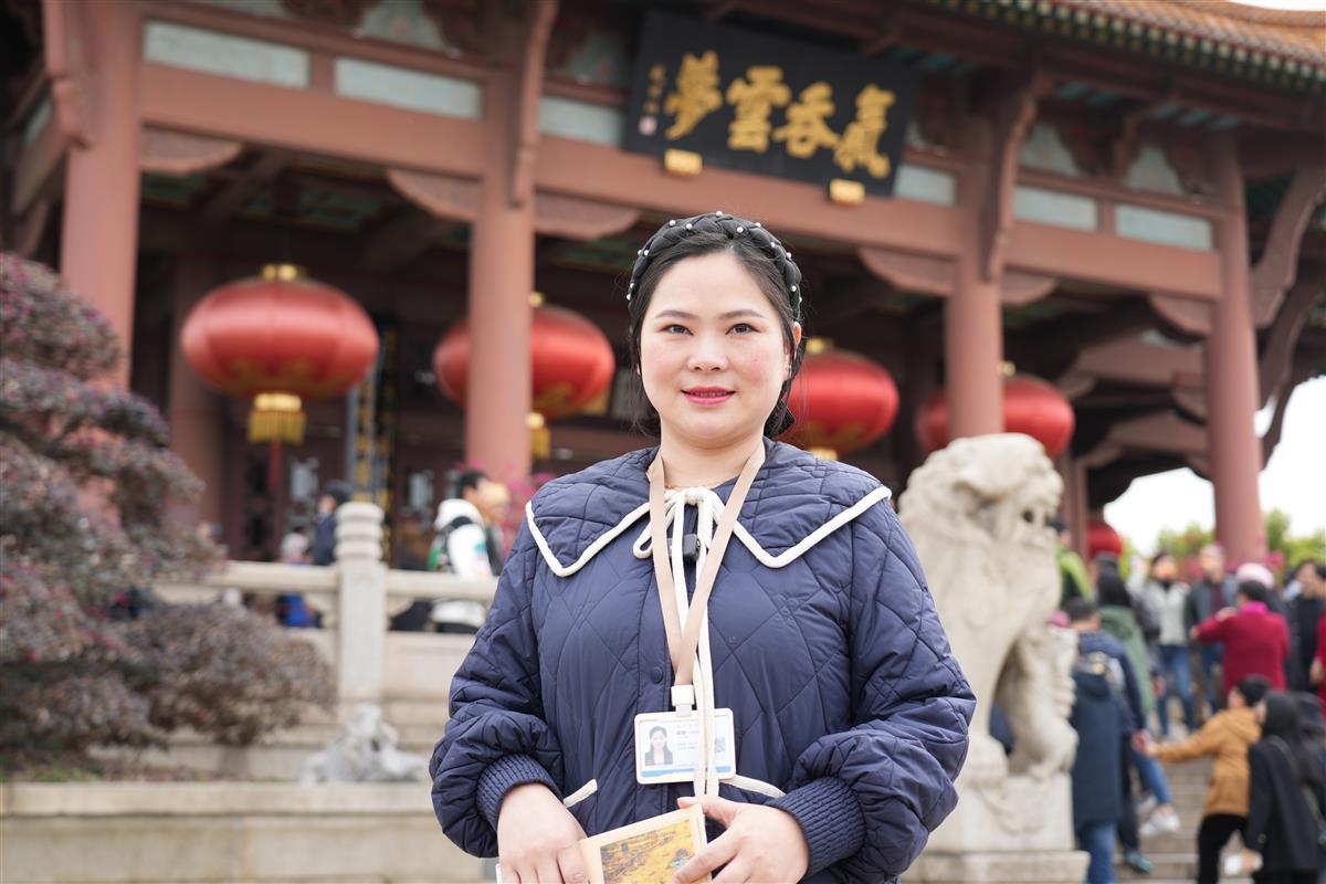 耐心解答完游客问题,大巴已到达黄鹤楼。园内人潮如织,登楼拍照的游客摩肩接踵。招呼着游客有序入园,陆媛带着游客边游览、边讲解,从千禧钟到主楼,从诗词歌赋到远古传说,将千年名楼的深厚历史娓娓道来。
