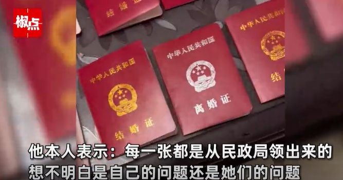 据河南广播电视台乡村观察、椒点视频消息,近日,上海一男子发布视频展示了自己的17张证,其中8本离婚证9本结婚证。