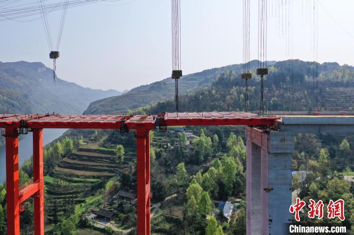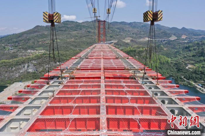 中新网贵州铜仁3月30日电 (记者 瞿宏伦)30日,随着一节重达180余吨的桥面梁精准就位,由中交一公局第四工程有限公司承建的贵州德(德江)余(余庆)高速公路乌江特大桥钢结构施工全面完成,大桥主体贯通。