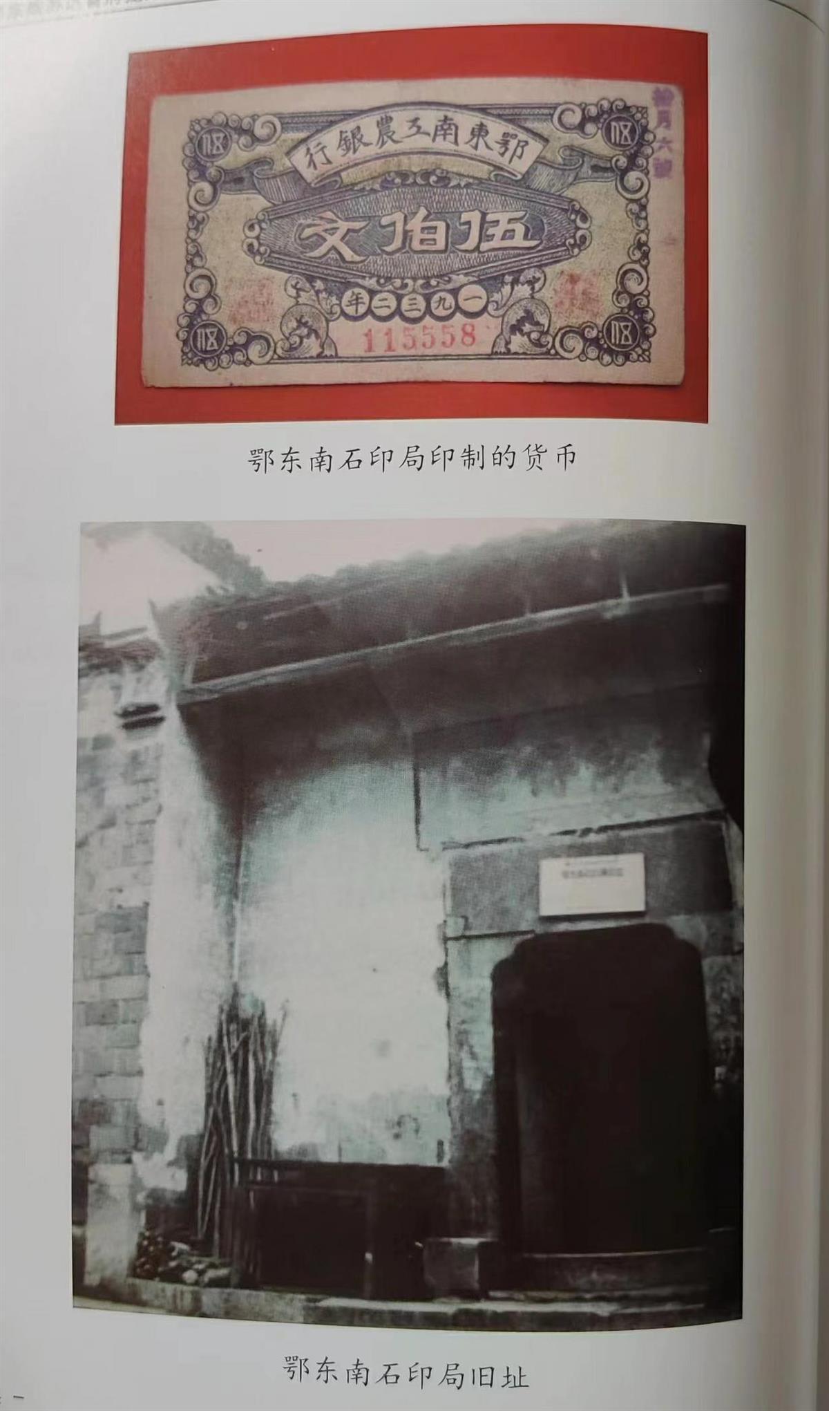 1932年印刷的纸币(上),鄂东南石印局旧址图(下)