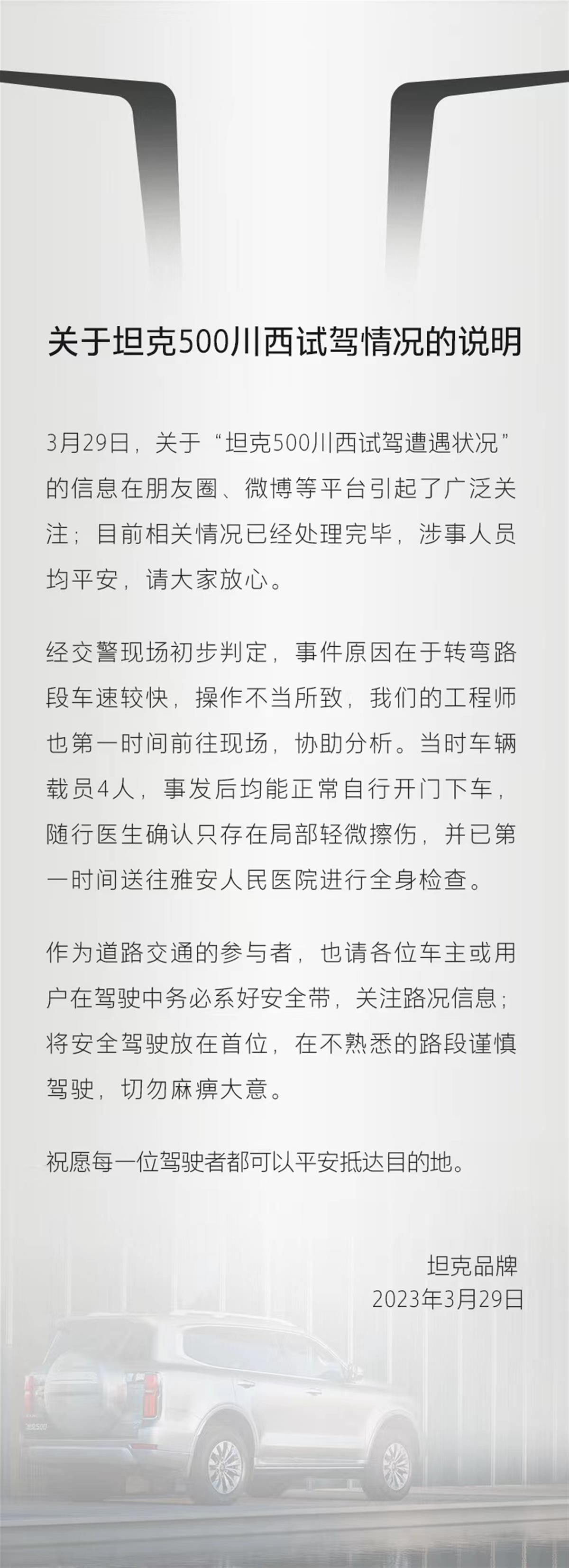3月29日下午,一辆长城坦克500越野车在川西高原一次试驾活动中冲出路面翻车。据品牌方说明,经交警现场初步判定,事故原因在于转弯路段车速较快,操作不当,车上人员局部轻微擦伤。