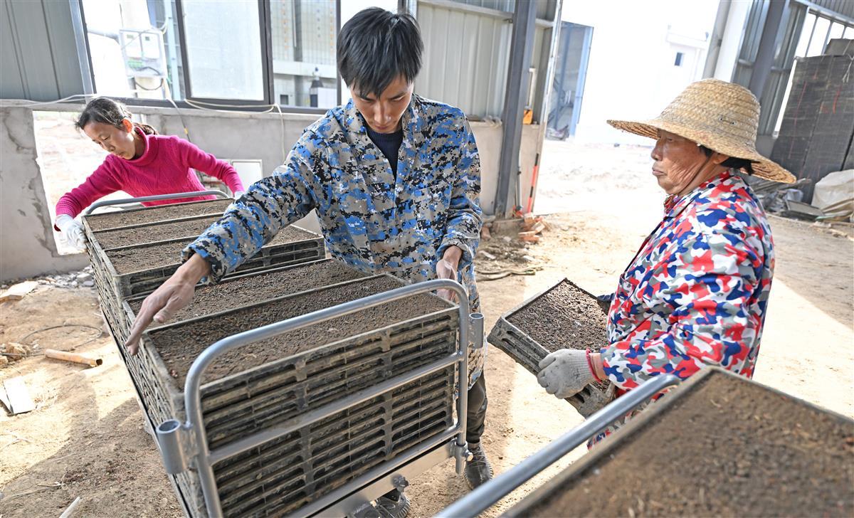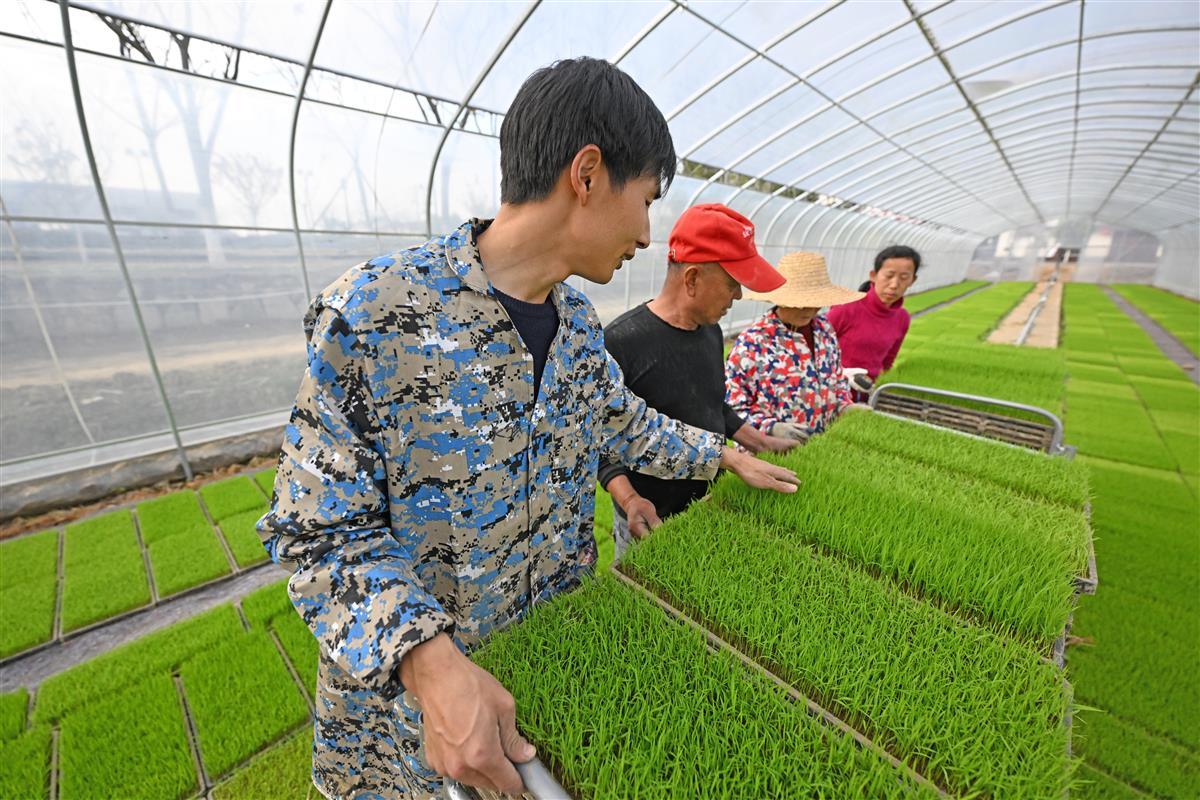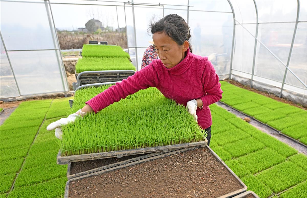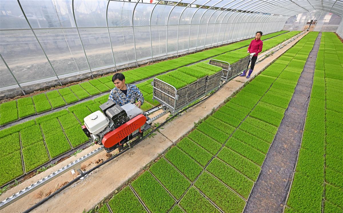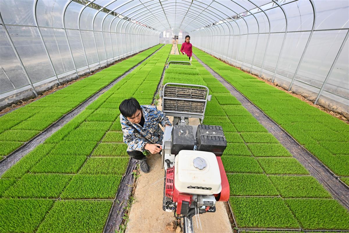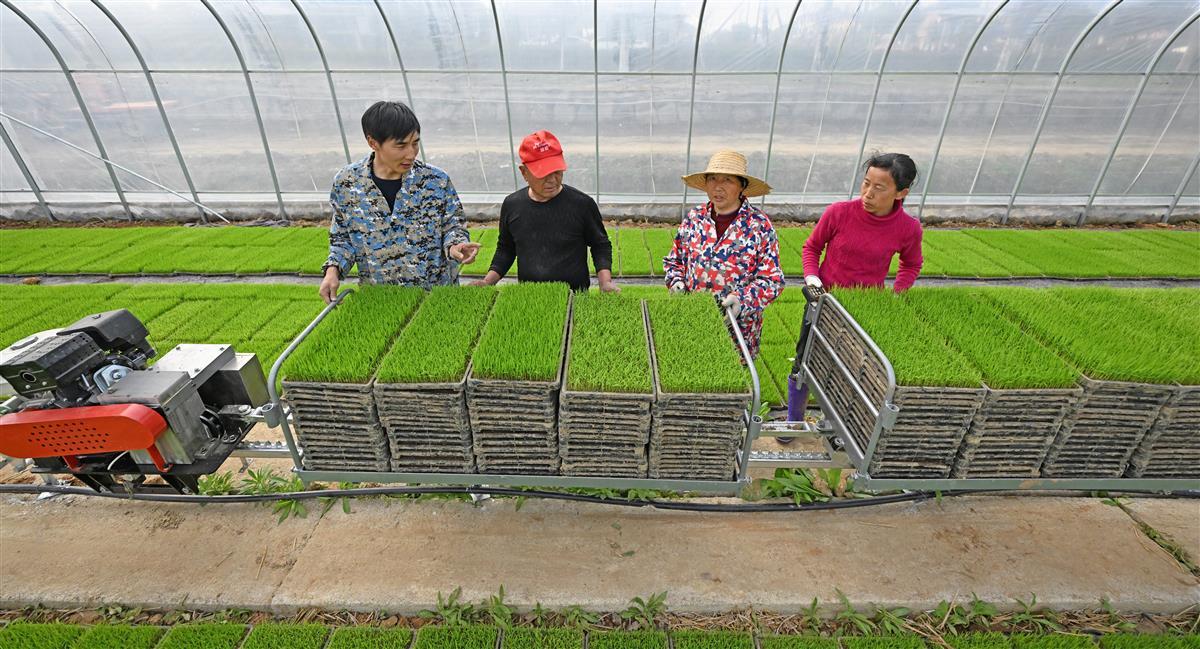 3月27日,枝江市董市镇绿景鑫水稻专业合作社的育秧大棚里,正在培育水稻秧苗的农民在车间内将培植好的盘秧装上小火车,单轨运输的小火车在大棚与车间之间来回欢快奔跑,一趟来回8分钟,能运输400盘秧苗。