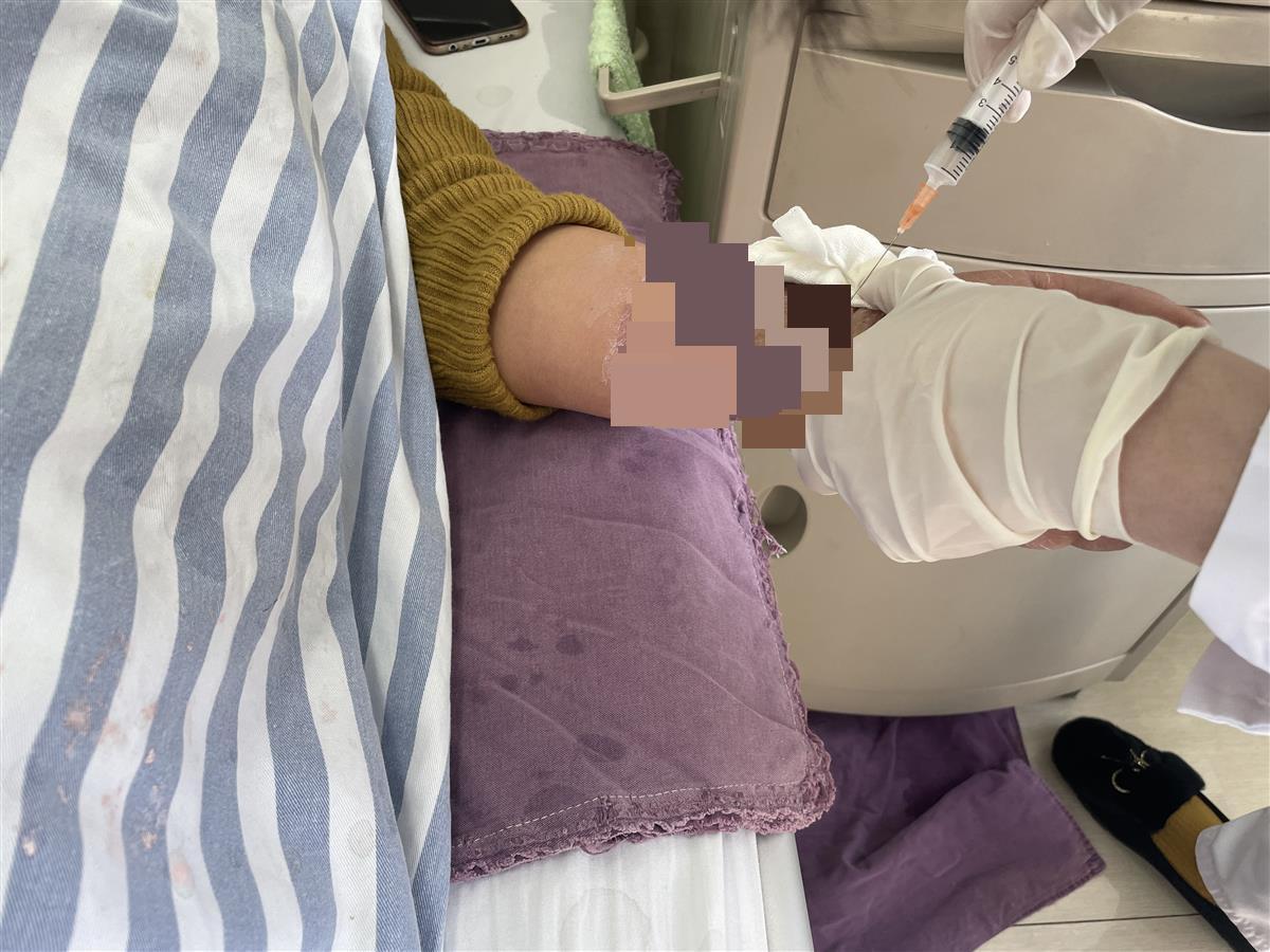 27日凌晨两点钟,刘女士觉得敷药的部位有点疼,拆开固定物后发现,自己左手腕及左前臂皮肤开始红肿。到了27日清早,刘女士感觉胳膊疼痛感加剧,左手腕及前臂不仅更加红肿,还有大量水泡及渗液。到了下午,刘女士感觉疼痛难忍,赶紧来到襄州区人民医院皮肤科就诊。
