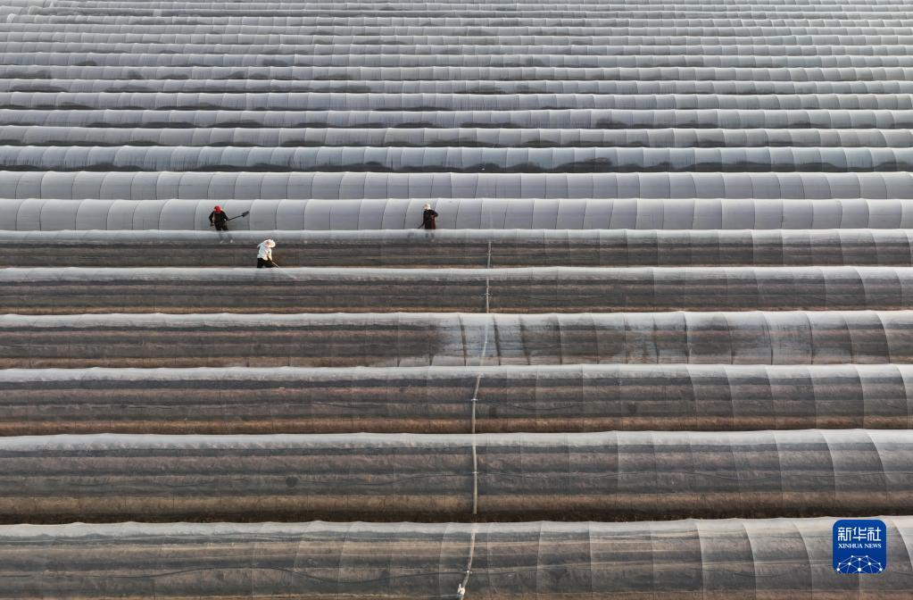 3月30日,唐山市丰润区新军屯镇的农民在田间给生姜棚膜覆土(无人机照片)。