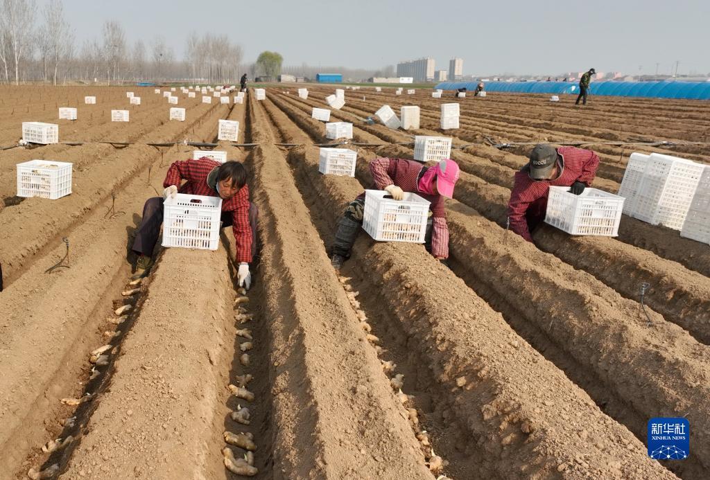 春日和暖,素有“冀东生姜之乡”美誉的河北省唐山市丰润区新军屯镇的农民抢抓农时种植生姜,田间呈现出一派繁忙的春播图景。据介绍,今年该镇生姜种植面积预计达4万多亩。