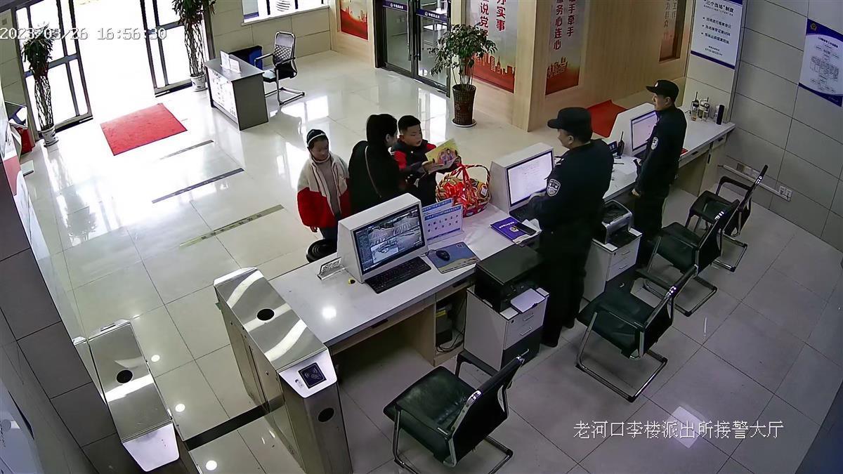 据介绍,26日17时,9岁的小星在妈妈和妹妹的陪同下,来到老河口市李楼派出所。刚迈入值班室大门,小星便和妹妹一路小跑到接警台,显然是认出了帮自己找回手表的民警汤宇。