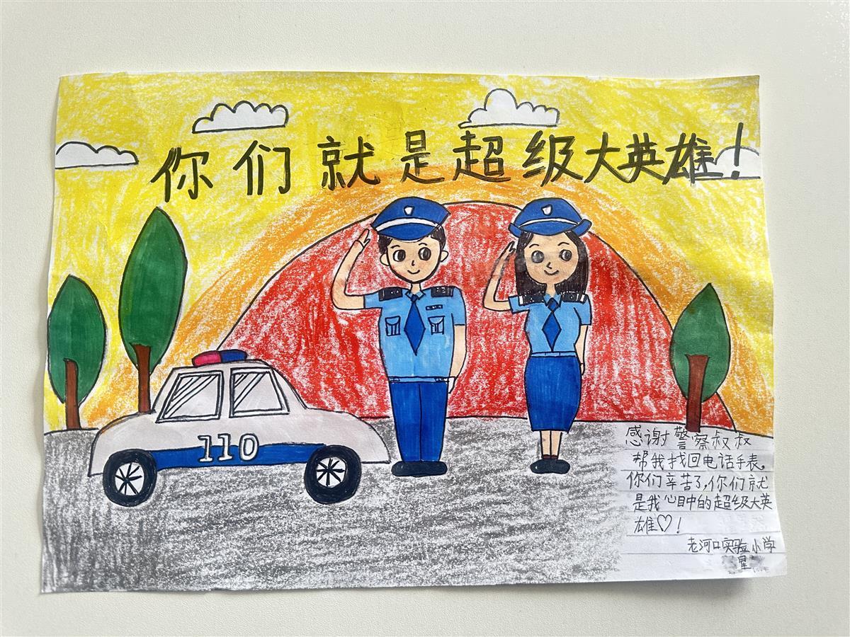 “谢谢叔叔帮我找回电话手表”,小星边说边从兜里拿出失而复得的手表,高举着给值班民警展示,收好手表后,又忙不停拿出一幅画递给汤宇,一旁的妈妈一直微笑。“谢谢,谢谢。”汤宇接过画,只见画面很是丰富,远处有云朵、高山和树木,近处两名警察正站在警车旁执勤,小星还特意写了字——“你们辛苦了,你们就是我心目中的超级大英雄。”写得很认真,字体也很可爱。