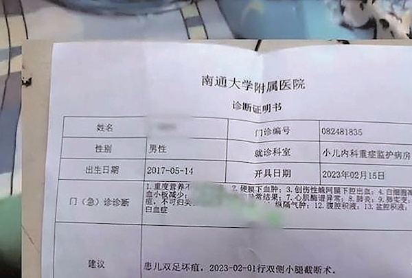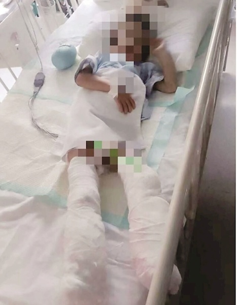 今年1月2日,孩子母亲打来电话说儿子生病了,腿不能走路。门先生赶回家后,发现儿子双脚红肿,第一节脚趾已经发黑,便送去医院治疗。儿子说妈妈让他站在冷水里,还用热水烫他。门先生怀疑儿子被虐待,遂决定报警。因双足坏疽,小宣2月1日接受了双侧小腿截断手术。