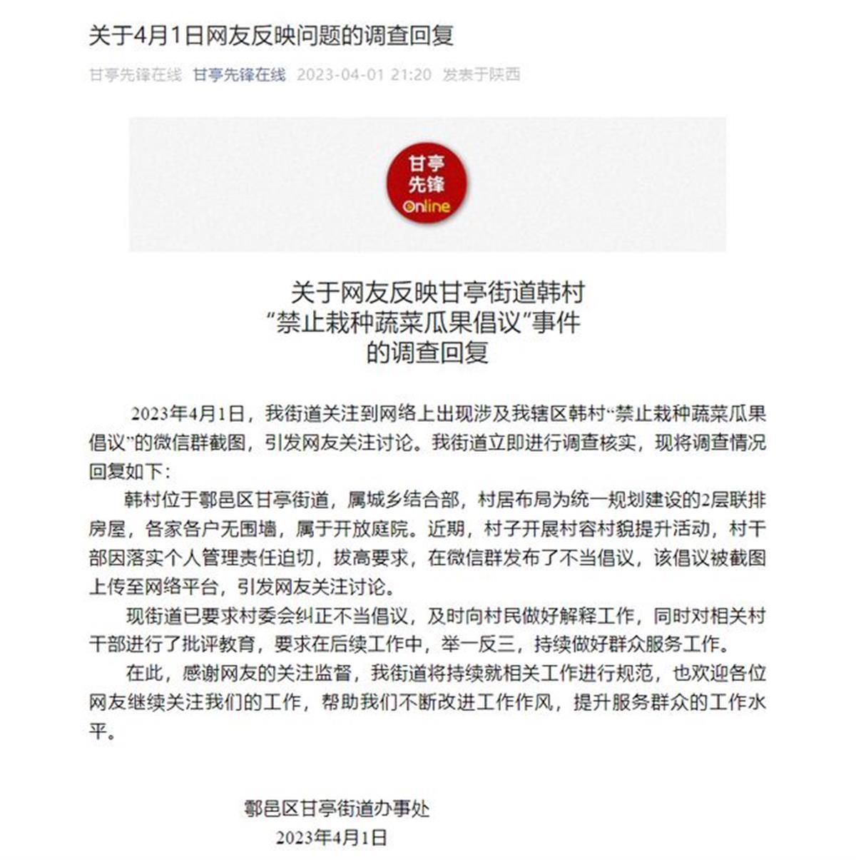 4月1日,陕西西安。有网友在微博发布聊天截图称,有人在群里发布《禁止栽种蔬菜瓜果倡议》,称按照国家创建诗画鄠邑品质新区,创建文明城市的要求,严禁各位村民在各家房前屋后种植带藤类、插杆类蔬菜,如黄瓜、西红柿、丝瓜、北瓜、西葫芦等。村委会将安排专人进行检查,一经发现直接进行拆除。(据4月2日北京青年报)