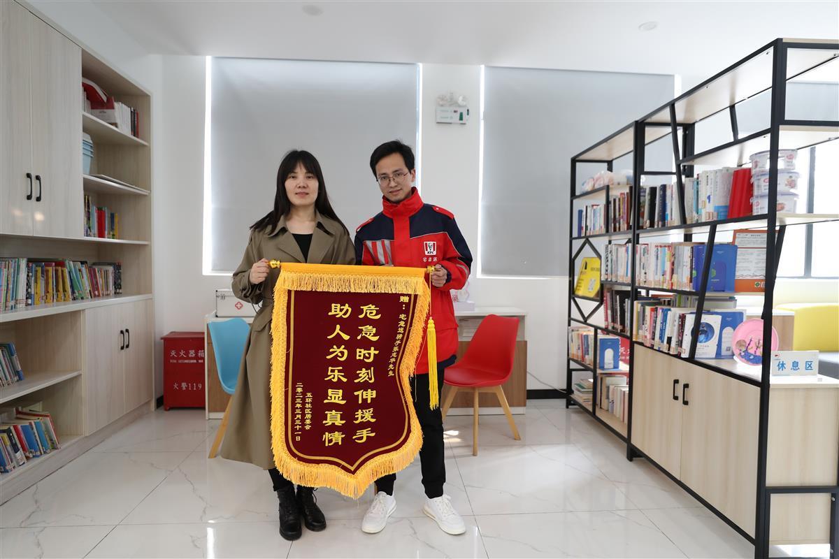 3月31日下午,武汉市洪山区卓刀泉街道五环社区党委书记法硕,代表社区居民来到五环商圈集聚区“江城蜂巢”,看望慰问外卖小哥张志华,送上锦旗和慰问品,对其机智反应救人一命的至善之举表示诚挚感谢。