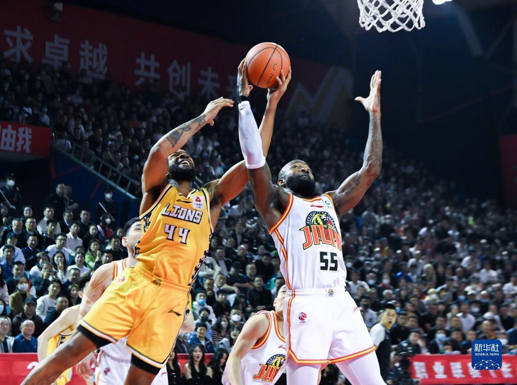 4月2日,吉林九台农商银行队球员琼斯(右)与浙江东阳光队球员威尔斯拼抢。新华社记者 颜麟蕴 摄