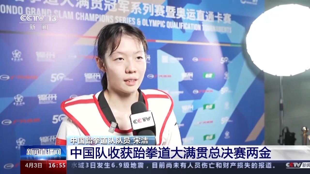 中国跆拳道队队员 宋洁:上次以2:1输给了她(塞西莉亚),这次主场地我状态调整得非常好,队友都在为我加油,感觉很有劲,就拿这场比赛了。