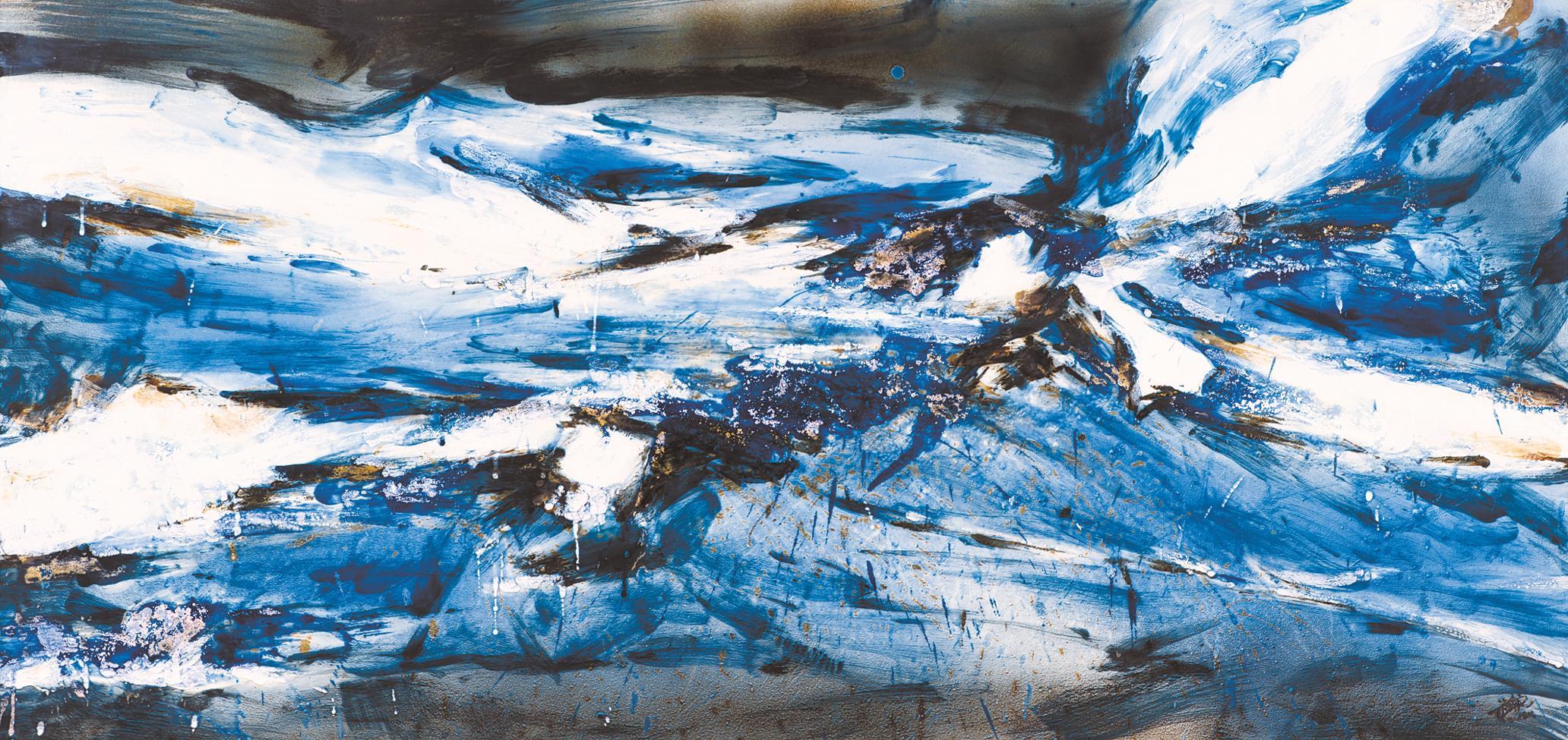 不同色相的蓝、大片的白,以及黄色、褐色糅合在一起,远处好似霞光……这幅画是什么?是海浪,是雪山?答案是:都可以。