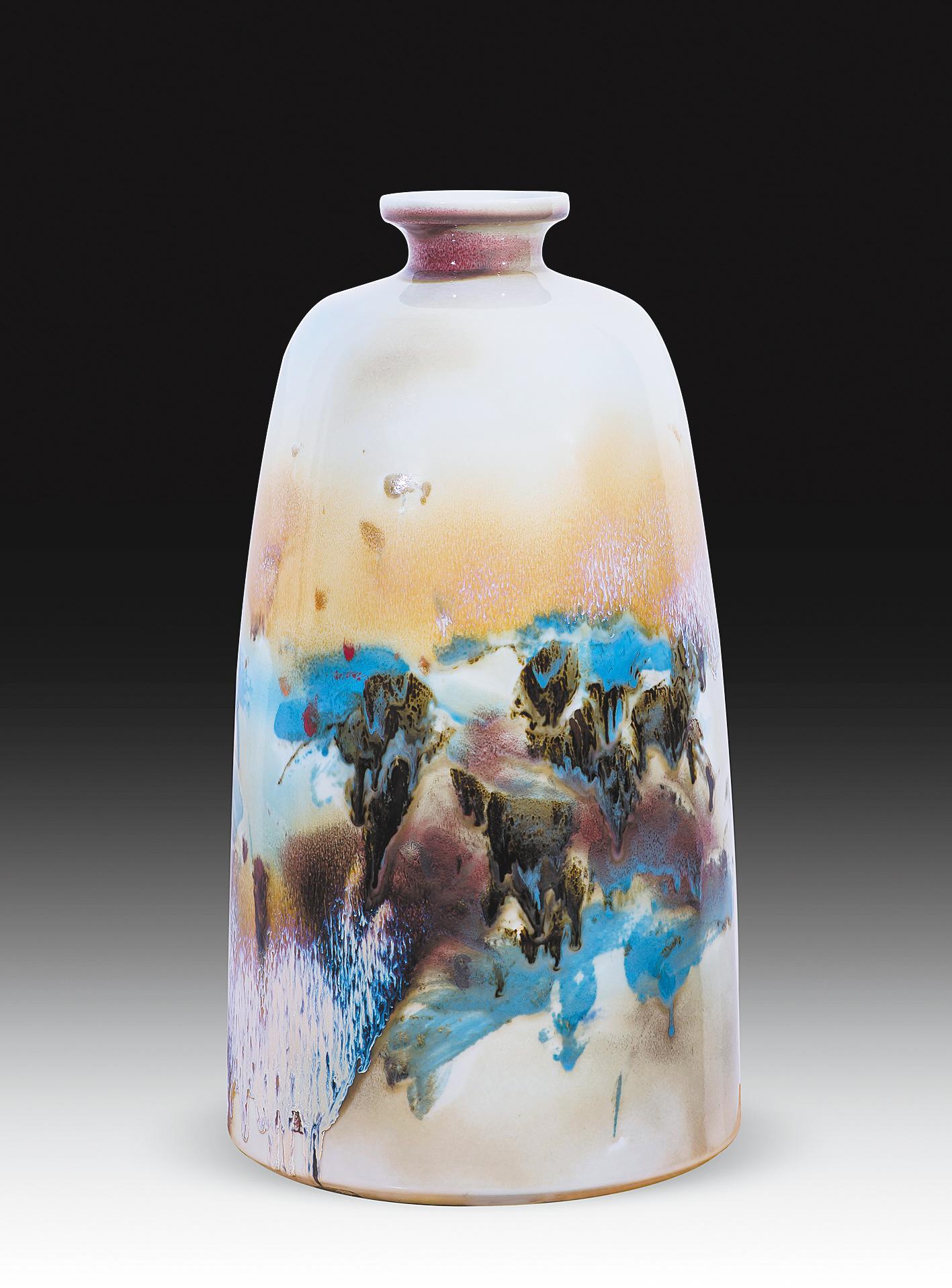 2006年前后,他接受委托,设计一款酒瓶,对方要拿到实实在在的设计产品,为此,他前往江西景德镇“驻场”。等待烧制的间隙,他和当地画师聊成一片,开始尝试釉彩画的创作,很快便迷上了釉彩自然流淌的感觉。