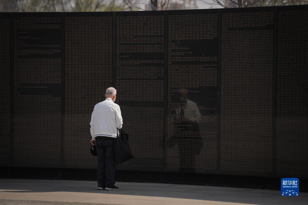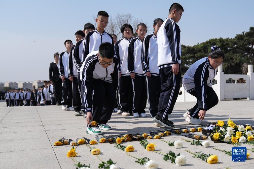 4月3日,沈阳市一四三中学学生在沈阳市抗美援朝烈士陵园向纪念碑献花。新华社记者 潘昱龙 摄